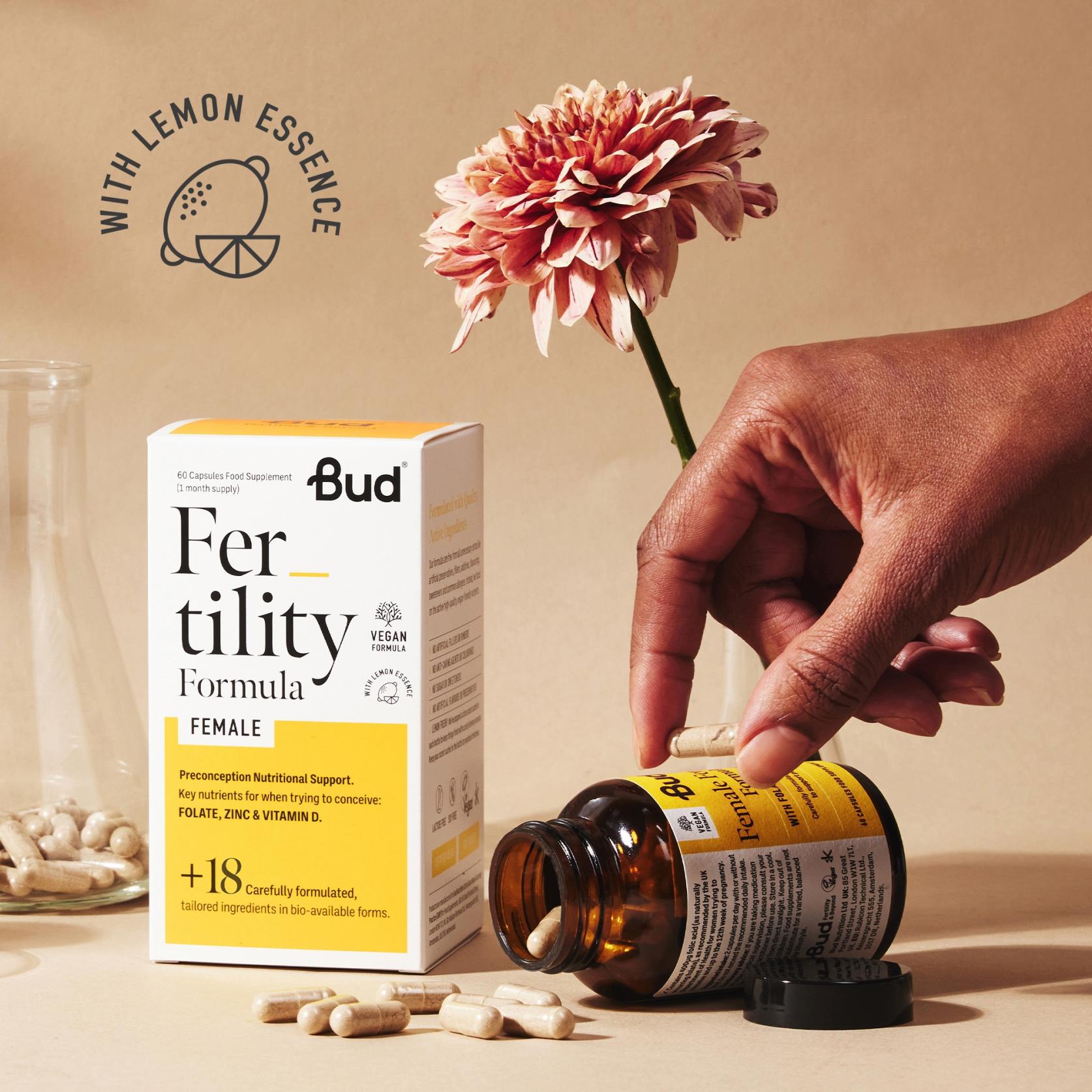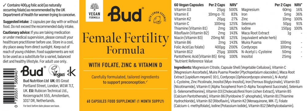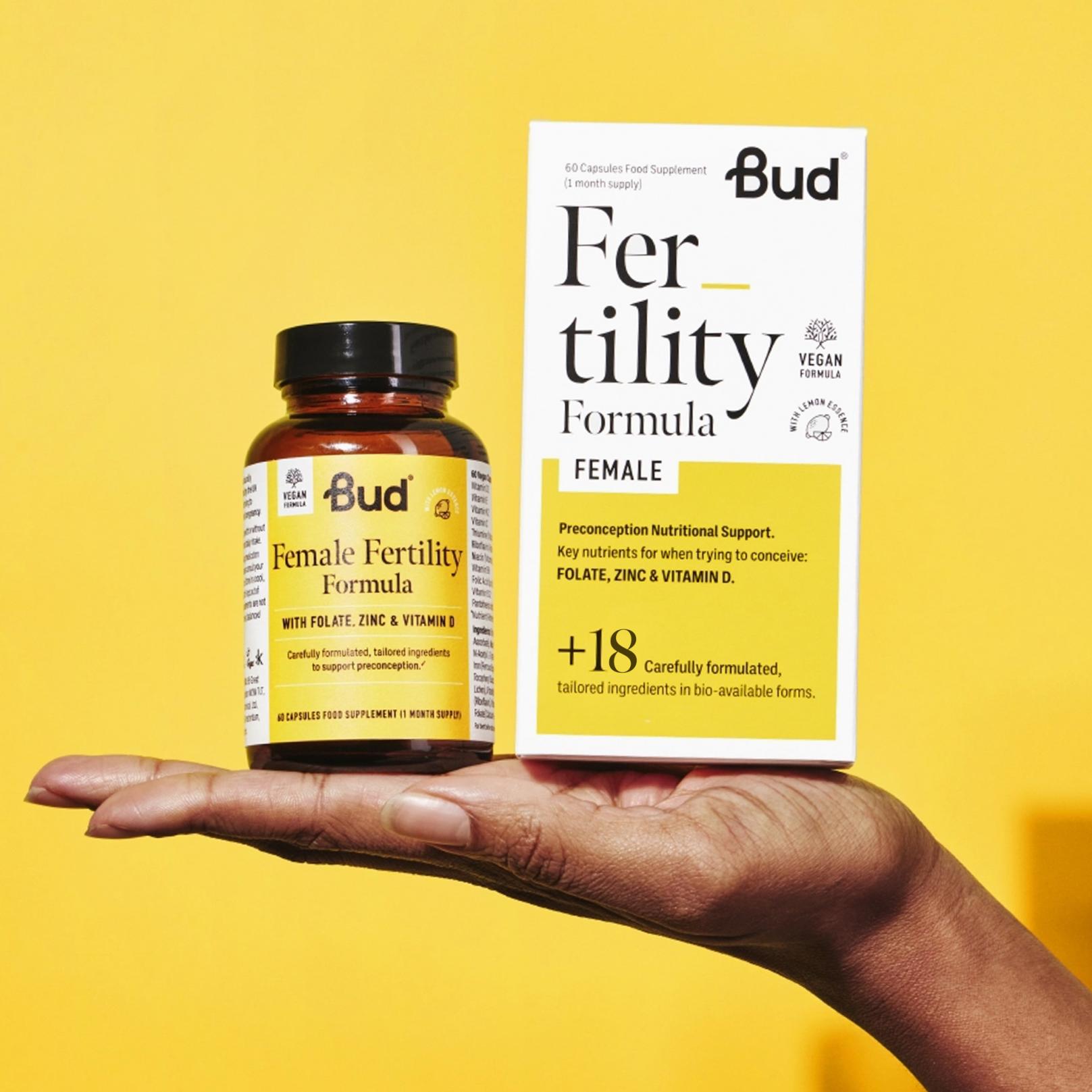 Specially formulated fertility supplement for women. Bud’s clean, vegan formulas contain 21 targeted vitamins, minerals and adaptogens to maintain reproductive health, support healthy conception and prepare the body for pregnancy. Includes folate (400mcg), zinc, vitamin D and inositol.